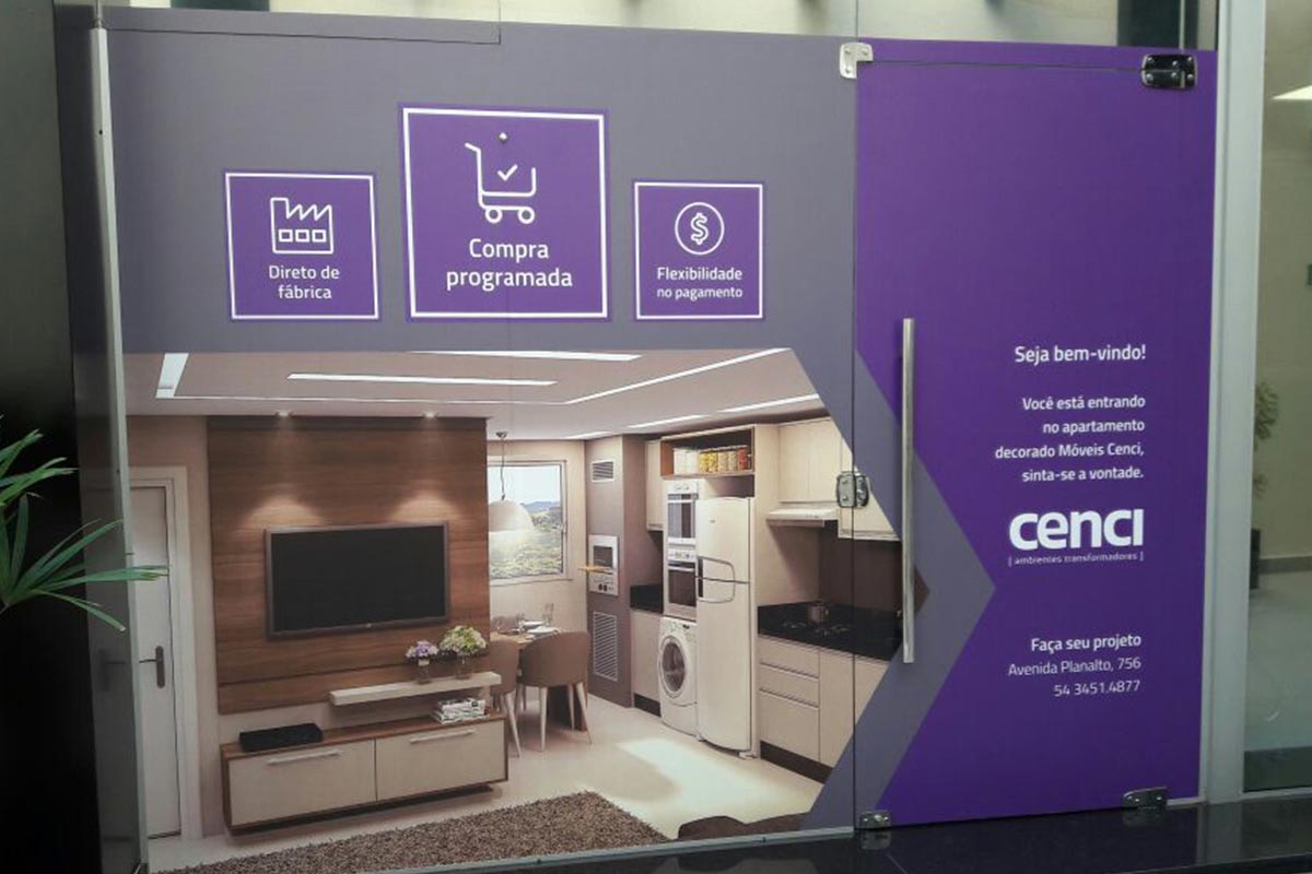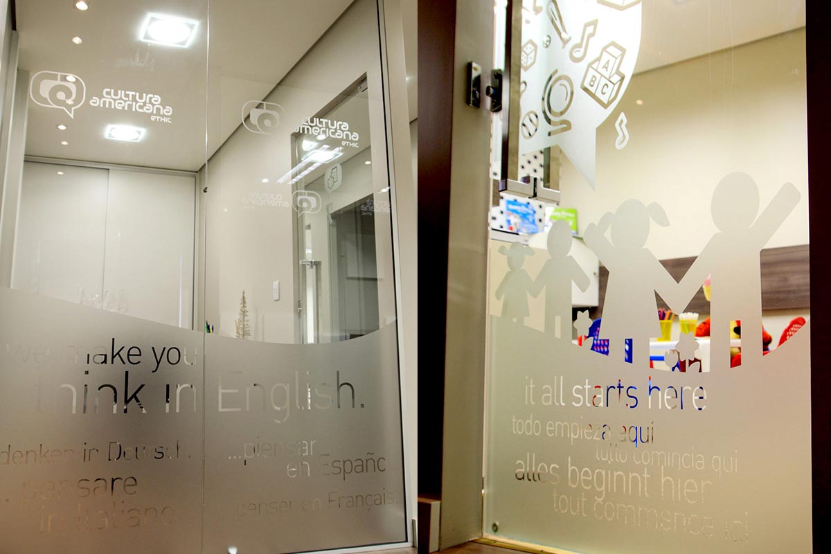 Sinalização e personalização de vitrines de lojas através de adesivos digitais, adesivos transparentes, adesivos jateados, adesivos coloridos com possibilidade de recorte e diversas composições.